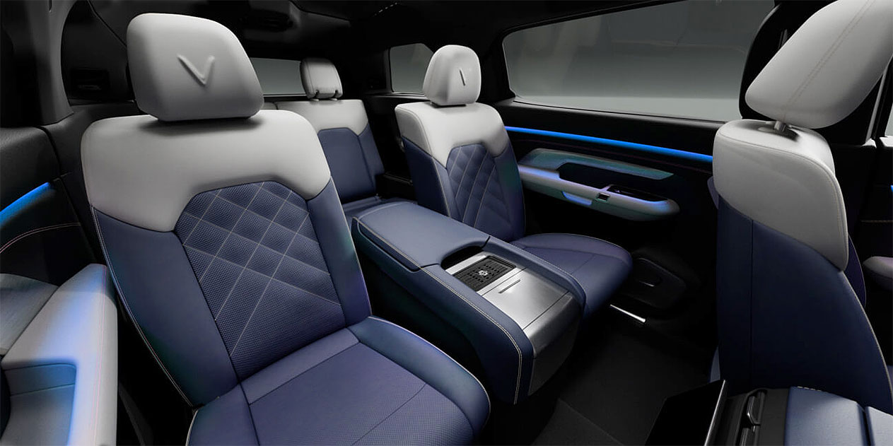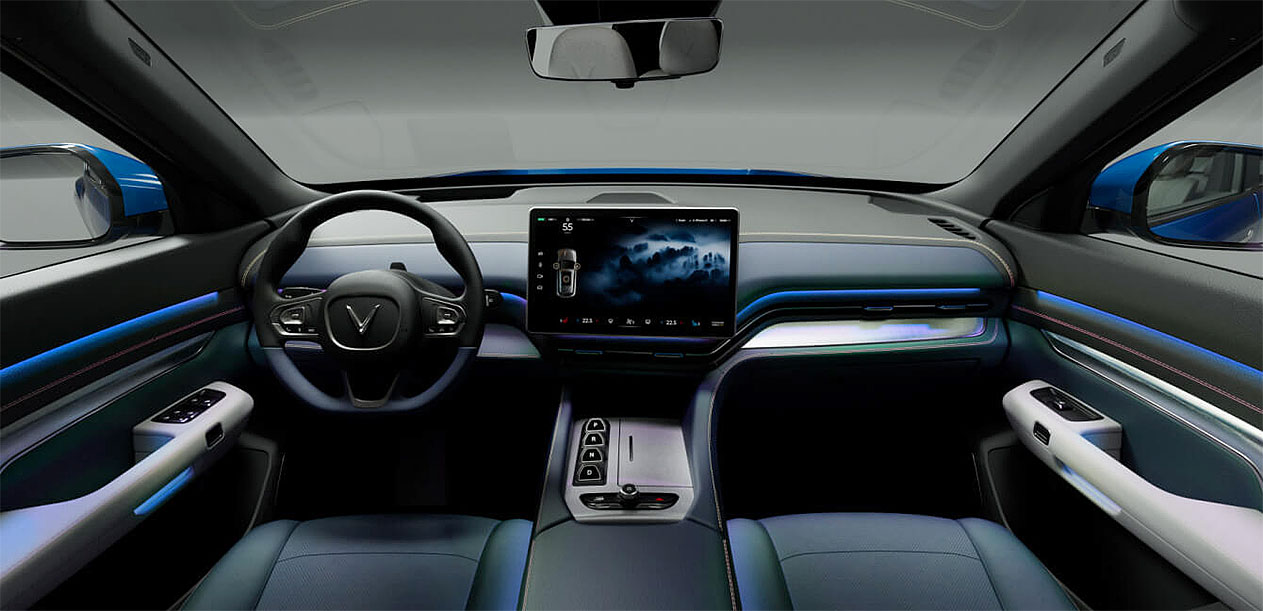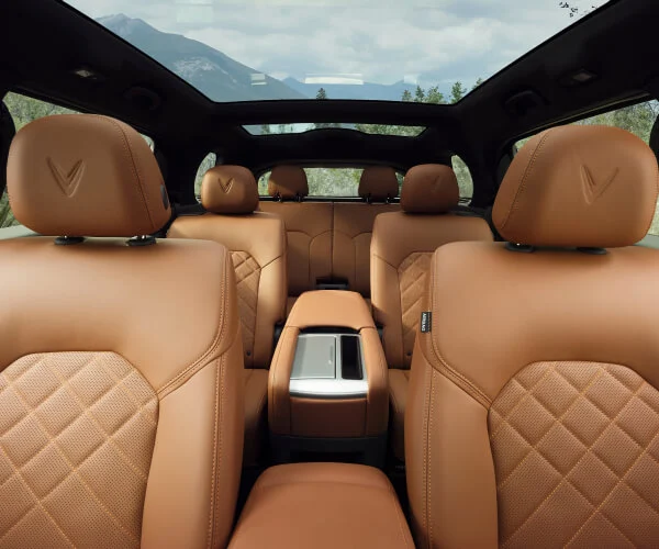 Nội thất: Nội thất VF9 tập trung vào sự thoải mái cho cả 3 hàng ghế. Ghế ngồi bọc da sang trọng, cửa sổ trời toàn cảnh, điều hòa 3 vùng độc lập, bảng điều khiển trung tâm tối giản nhưng hiện đại với màn hình 15.6 inch, vô-lăng tích hợp đa chức năng và bảng HUD tiện lợi.